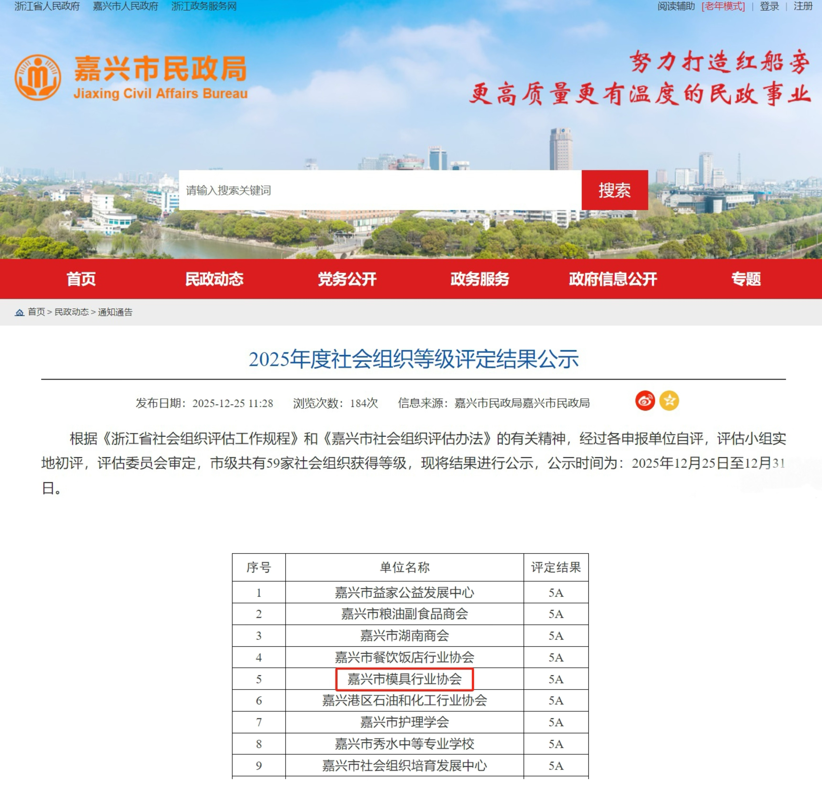 近日,2025年度嘉兴市社会组织评估结果正式揭晓,嘉兴市模具行业协会凭借规范的内部治理、卓越的行业服务成效,成功获评 “5A级社会组织” 称号!这一荣誉是对协会多年来深耕模具行业、赋能产业发展的高度认可,更是对全体会员单位凝心聚力、携手共进的有力见证!